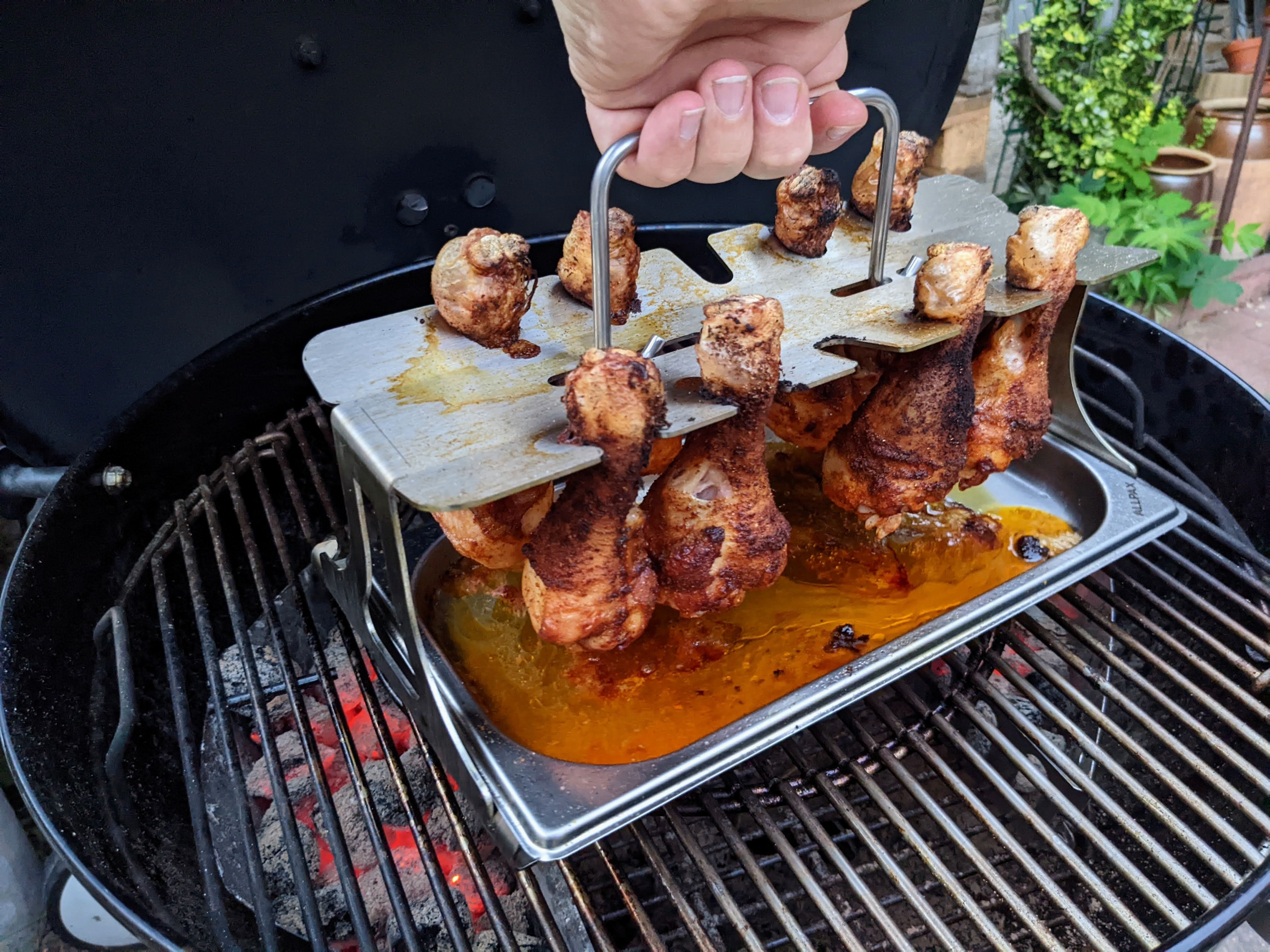 Machen bei solch einer Präsentation mächtig was her am Tisch. Durch den Abnehmbaren Griff, kann der Halter Gefahrlos vom Heißen Grill genommen werden und die Hähnchenschenkel können sofort am Tisch serviert werden.